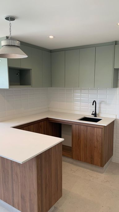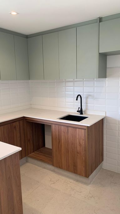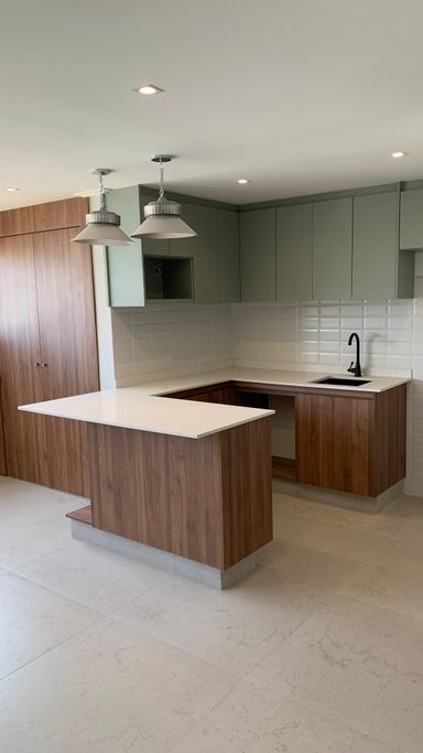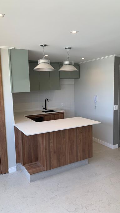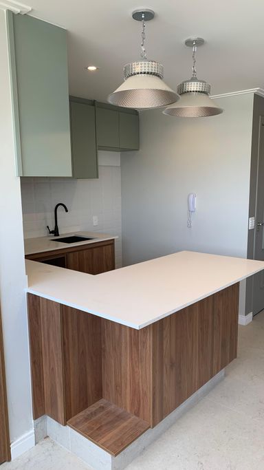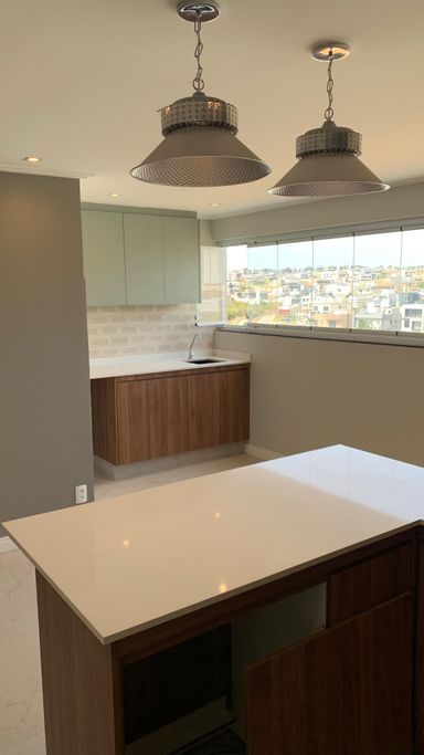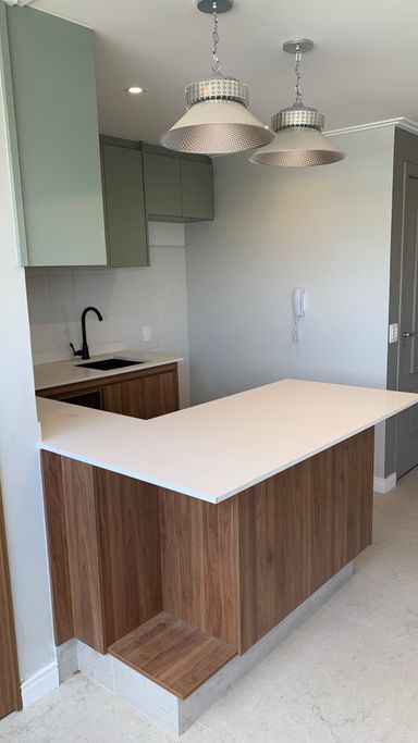 Balcões em quartzo branco e cozinha americana para um toque de elegância e praticidade.