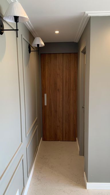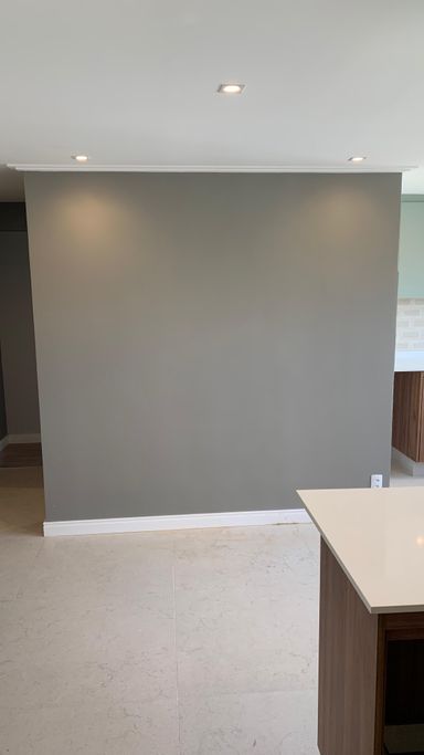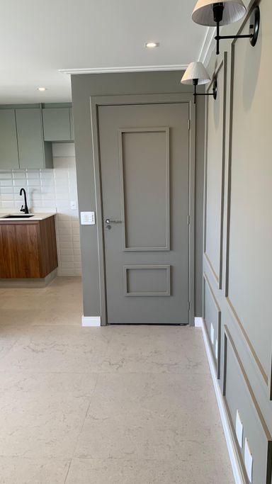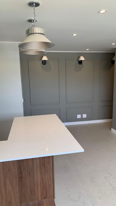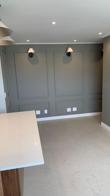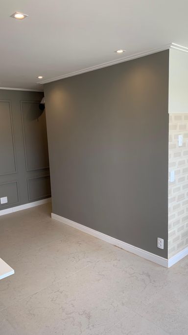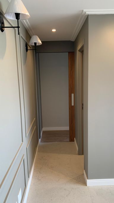 Detalhes sofisticados: teto rebaixado, molduras elegantes, rodapé branco em todo o apartamento.