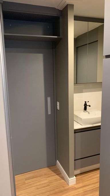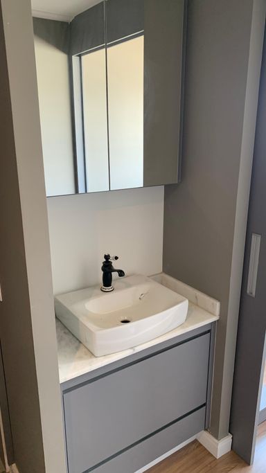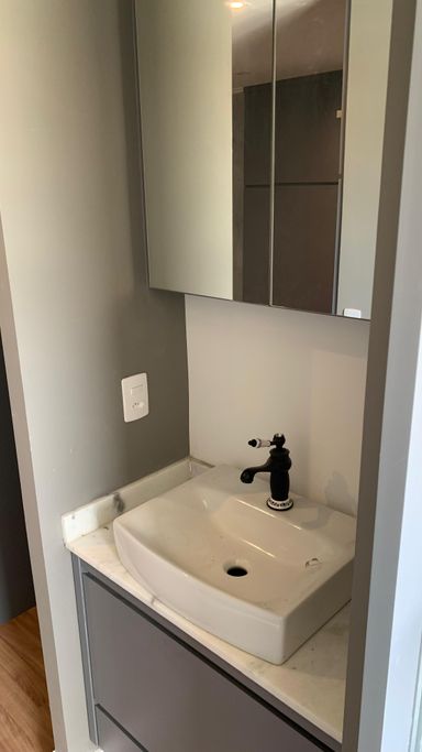 Projeto diferenciado: a pia em mármore está estrategicamente posicionada fora do banheiro, garantindo praticidade e privacidade.